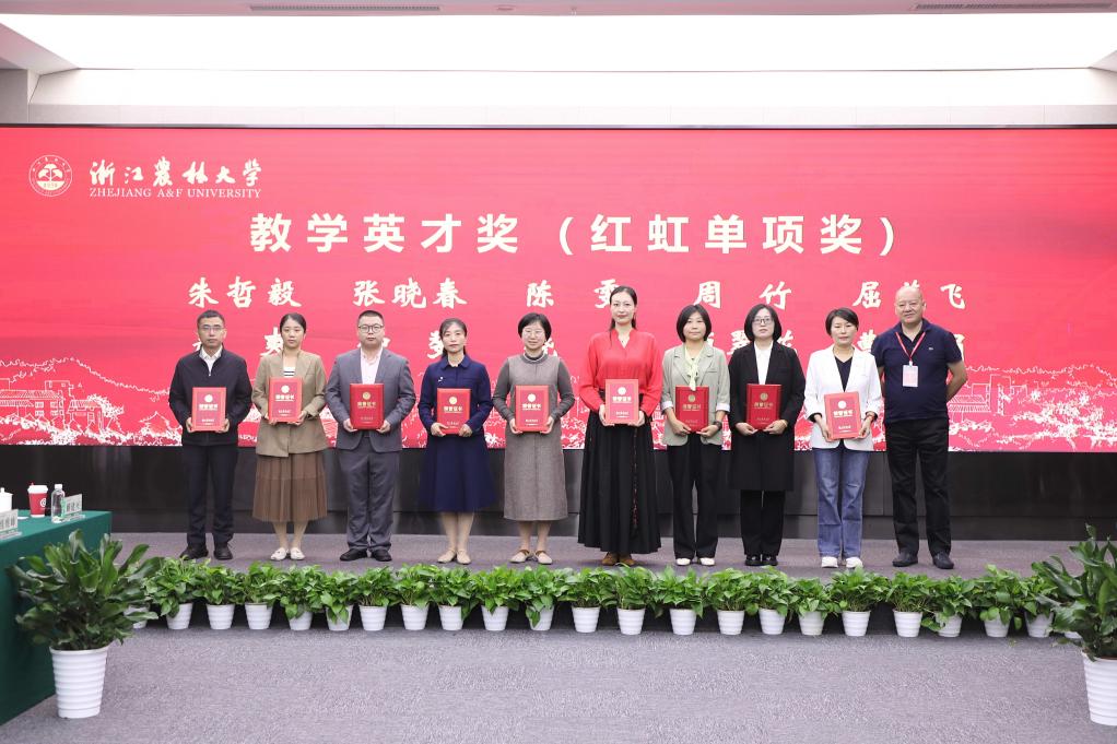 大會表彰了2024年度本科卓越教學教師(“紅虹”獎教金獲得者)。胡祖吉宣讀表彰文件,方志剛和周維亮為獲“教學卓越獎”的老師頒獎;“紅虹”獎教金捐贈方代表、經濟林87級校友、上海紅虹木業有限公司總經理丁岳軍為獲“教學樹人獎”和“教學英才獎”的老師頒獎。
